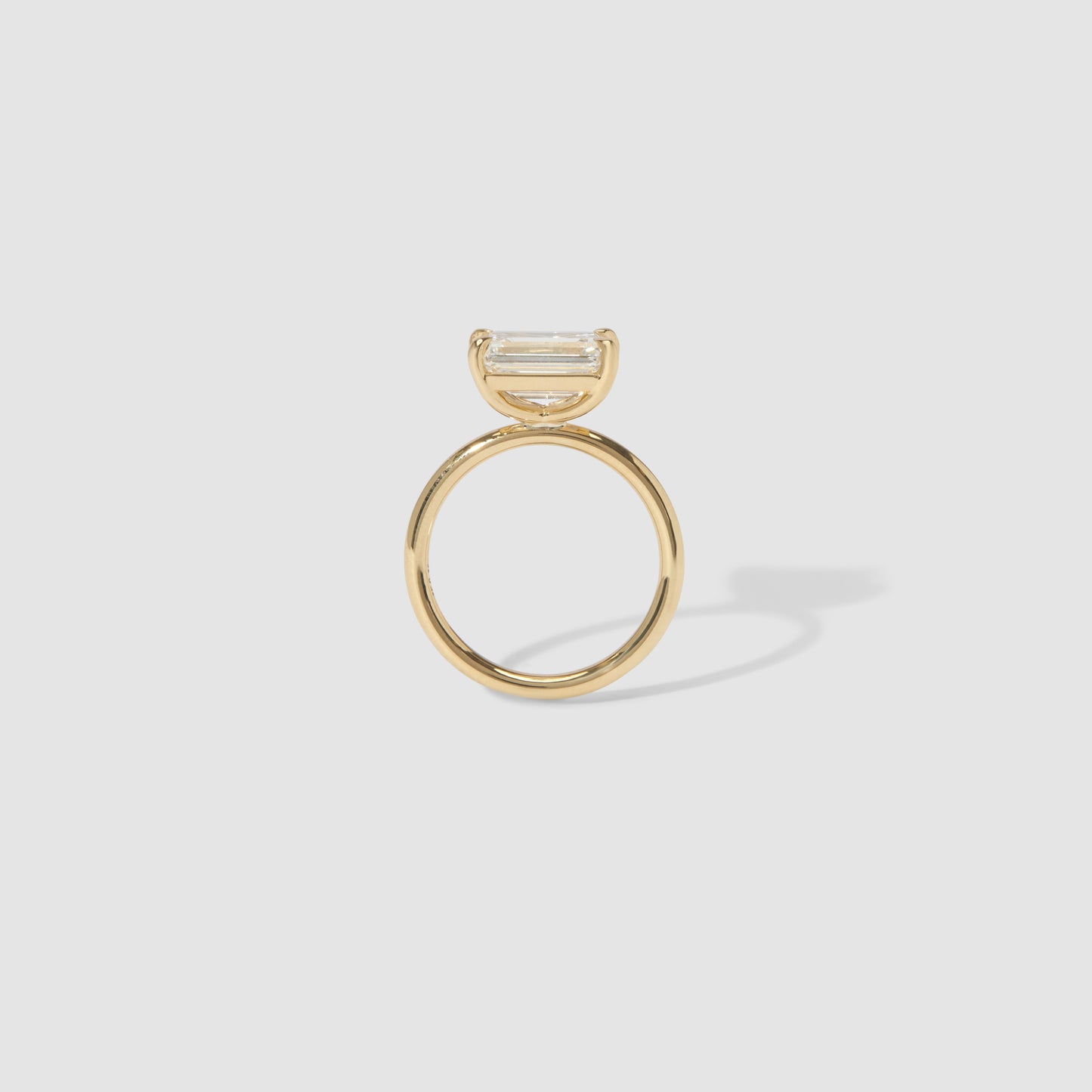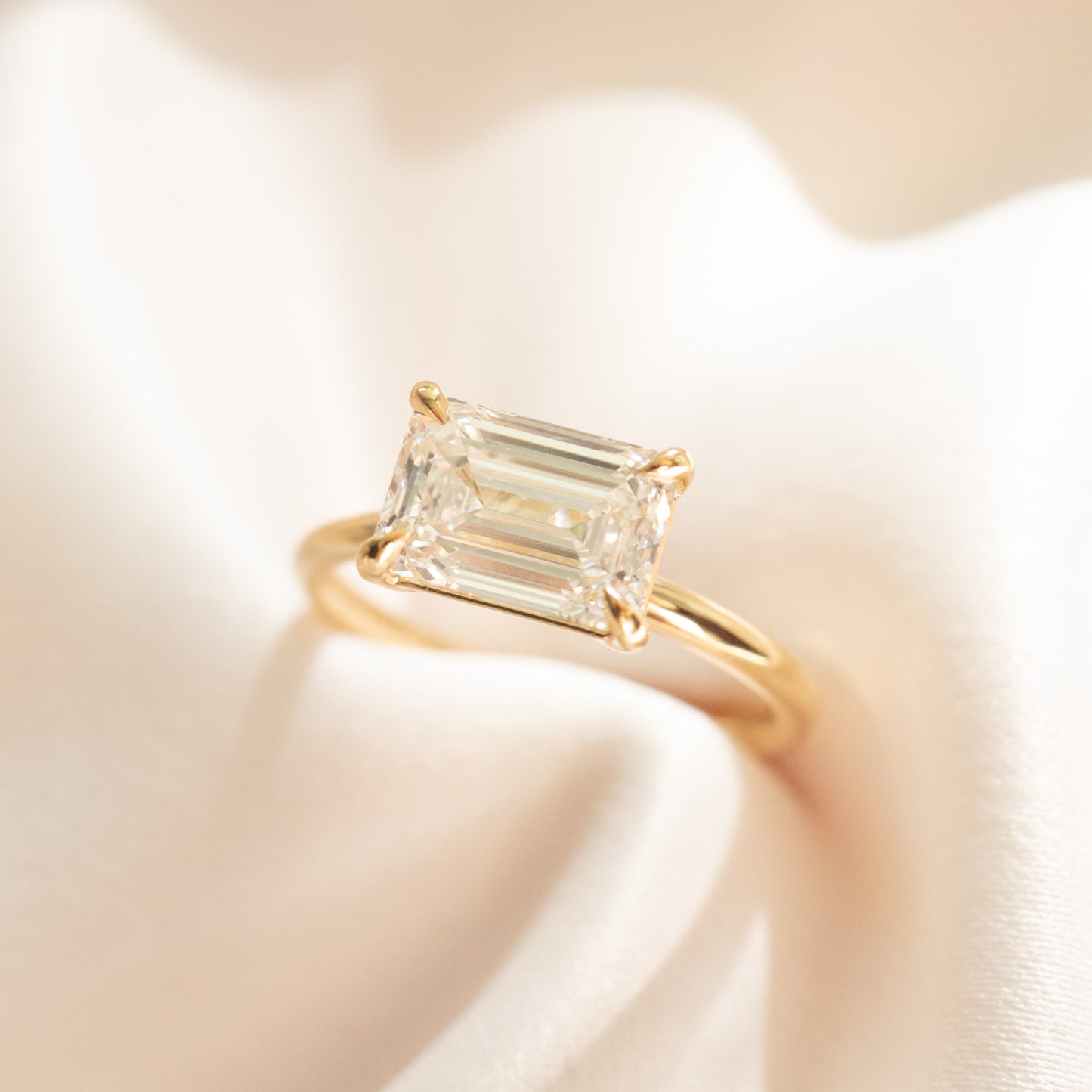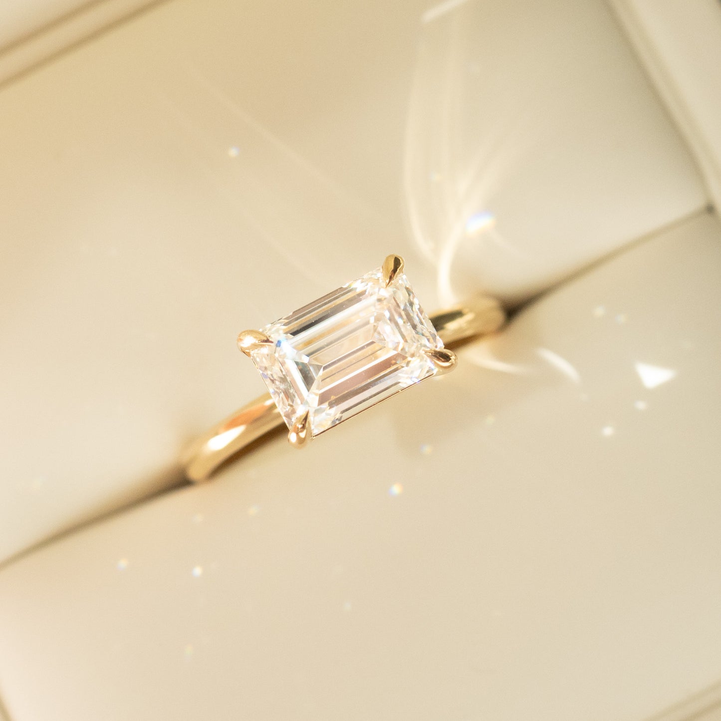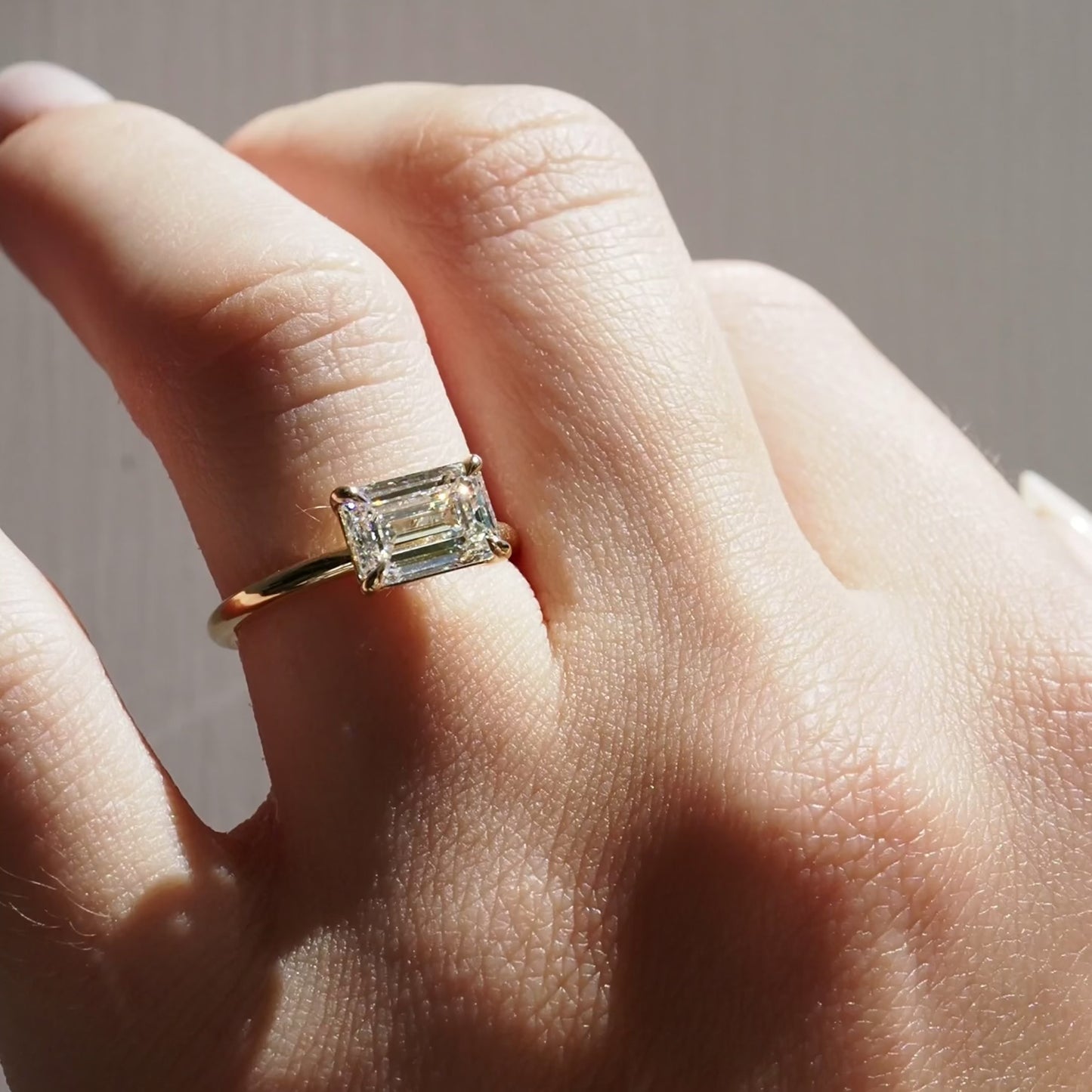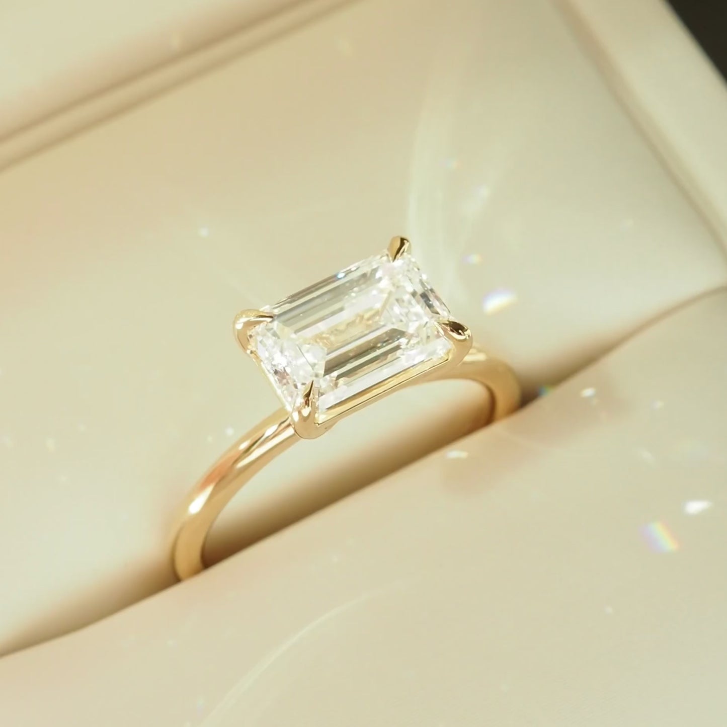 A beautiful east-west set Emerald cut solitaire — ready to wear