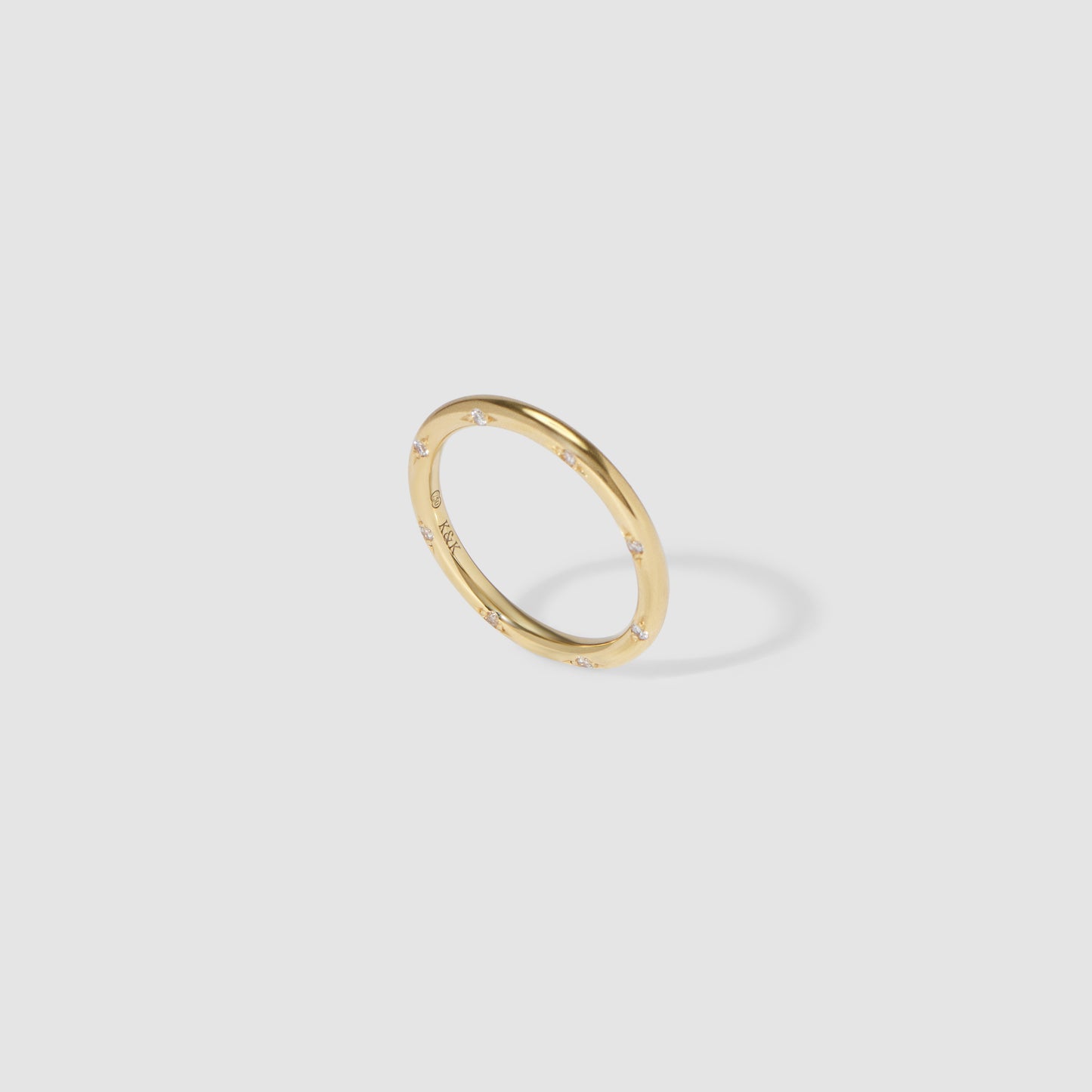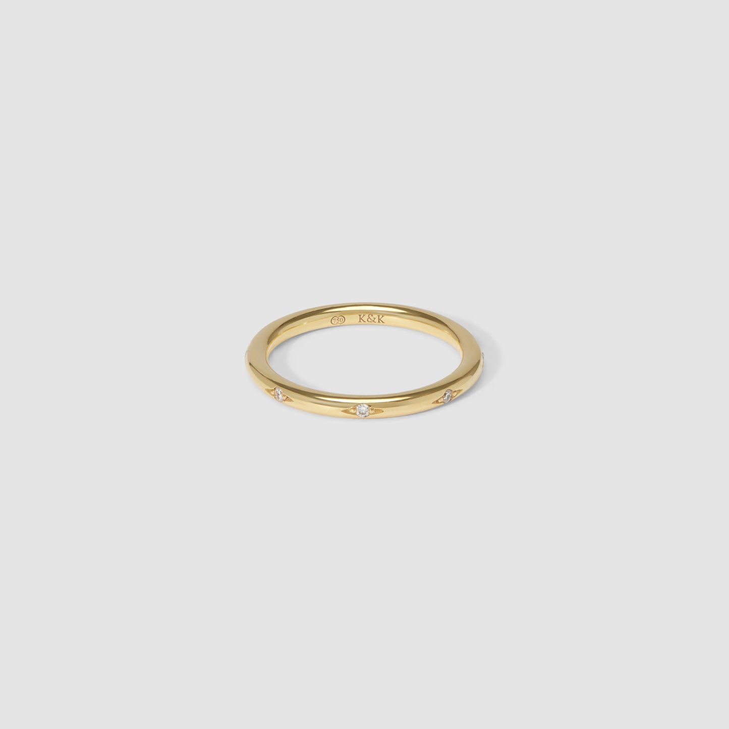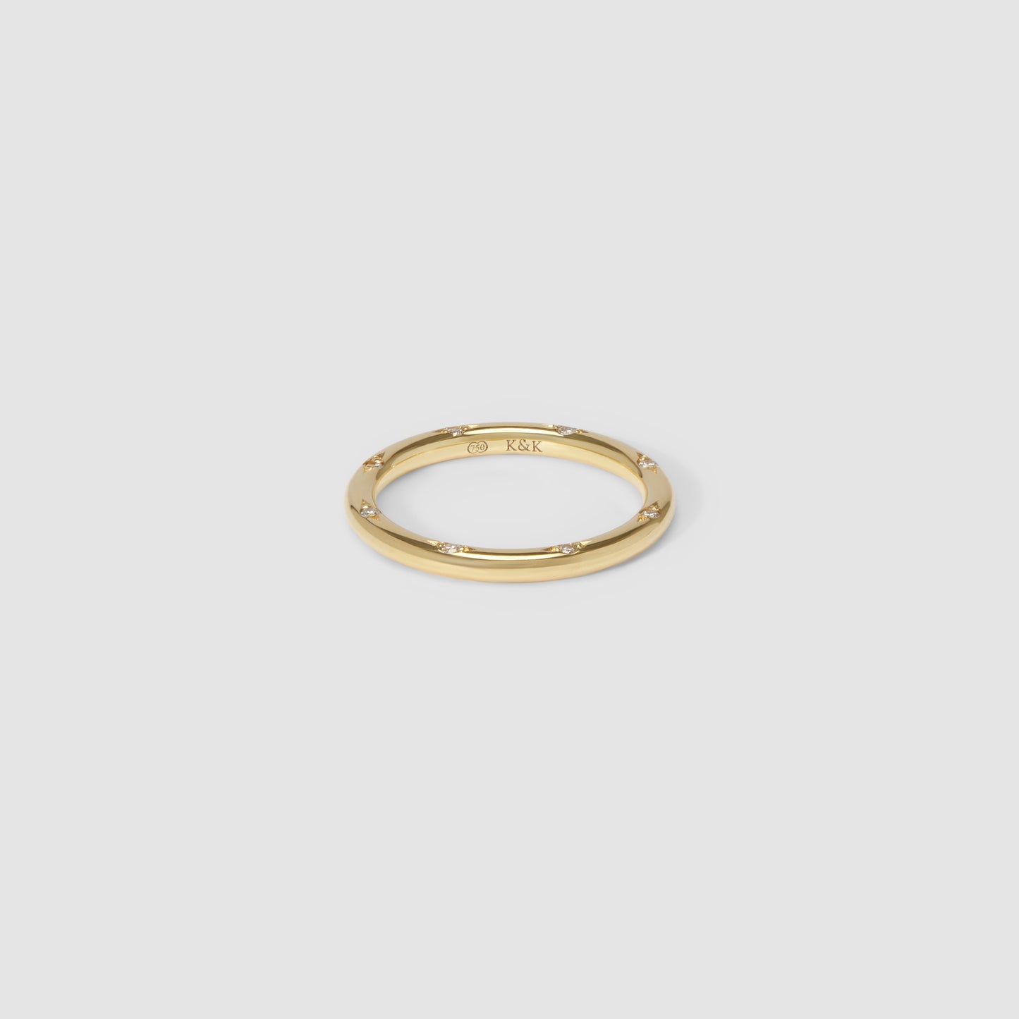 A solid gold round profile band for the modern minimalist — set with eight ornately set lab-grown diamonds spaced along the top or side edge