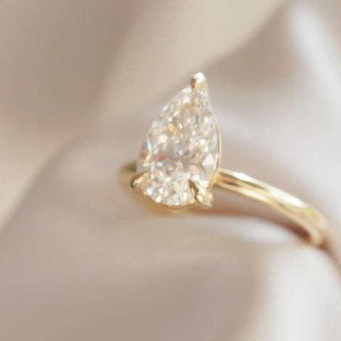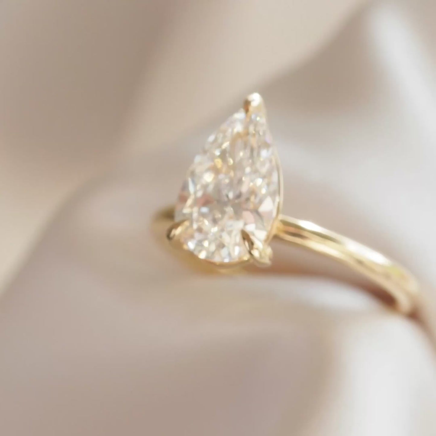 A feminine three claw solitaire engagement ring — featuring a pear cut lab-grown diamond held atop our signature sweep style band