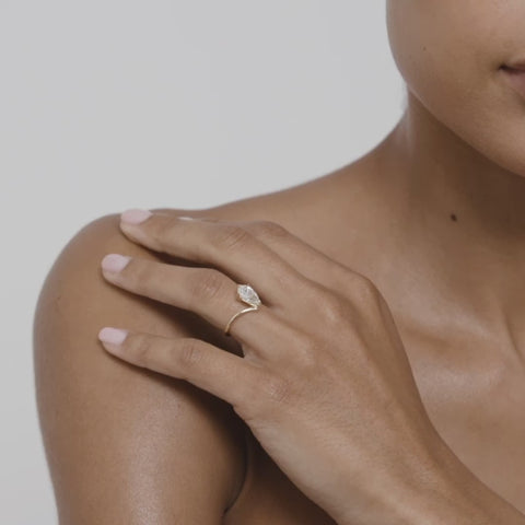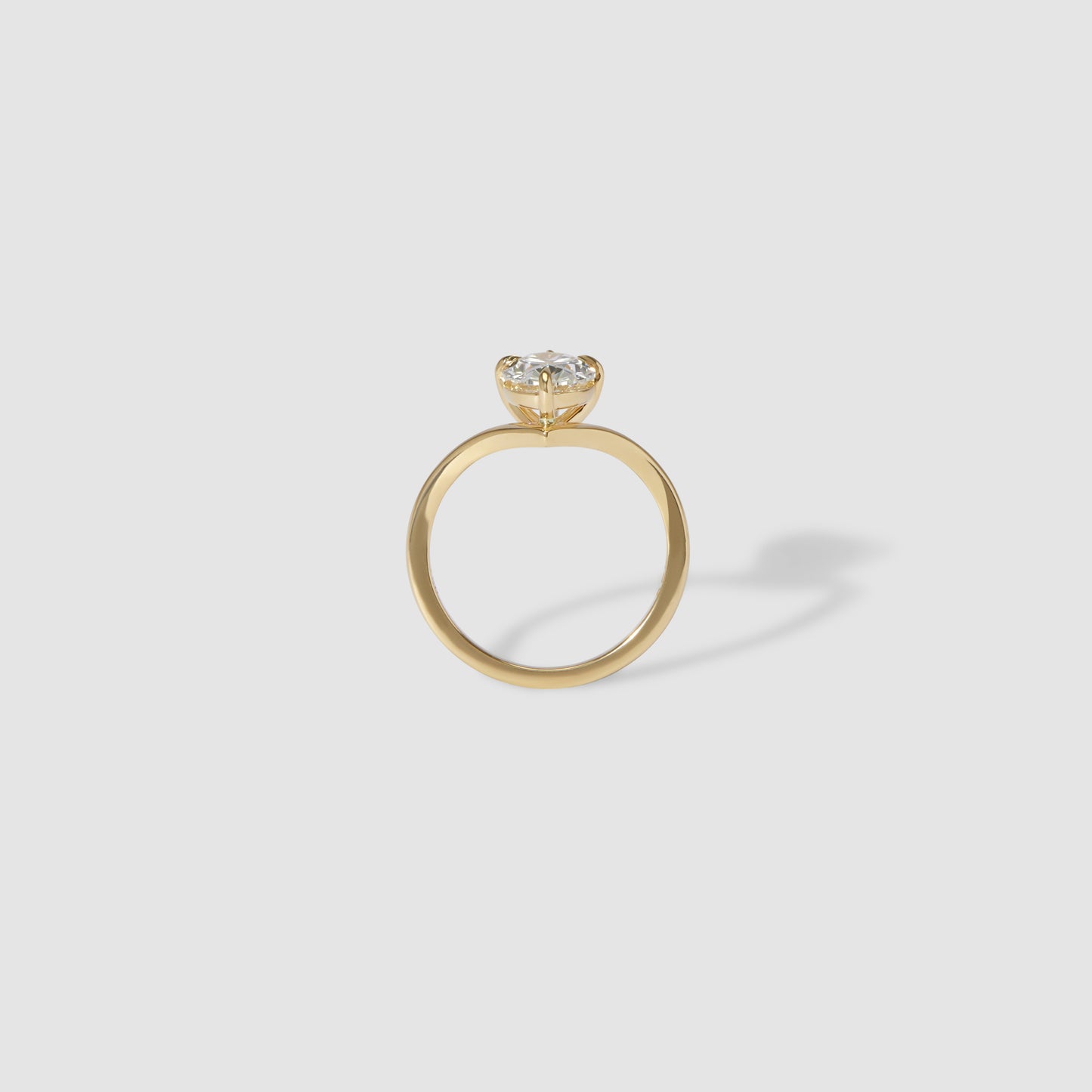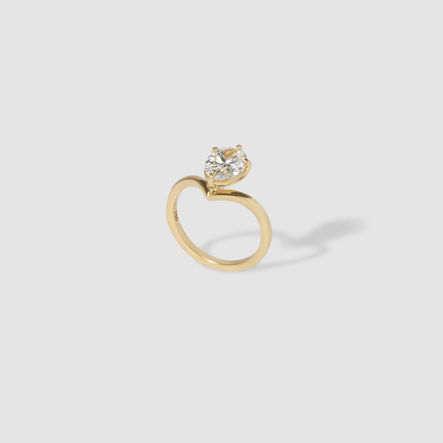 A piece that provides the breathtaking illusion of a floating oval lab-grown diamond, consciously caressing the surface of the finge