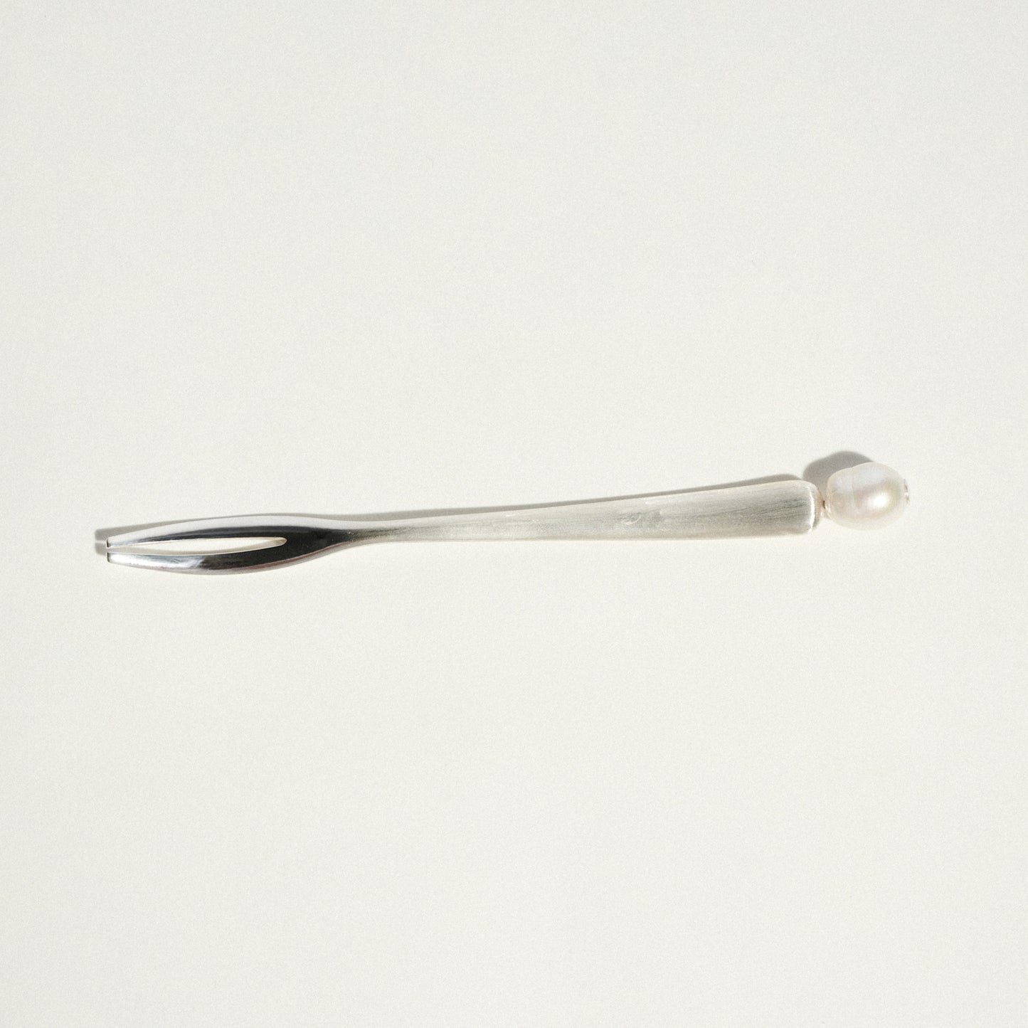 A fine object that transforms the moment—our sculptural oyster fork in solid silver, detailed with a freshwater pearl
