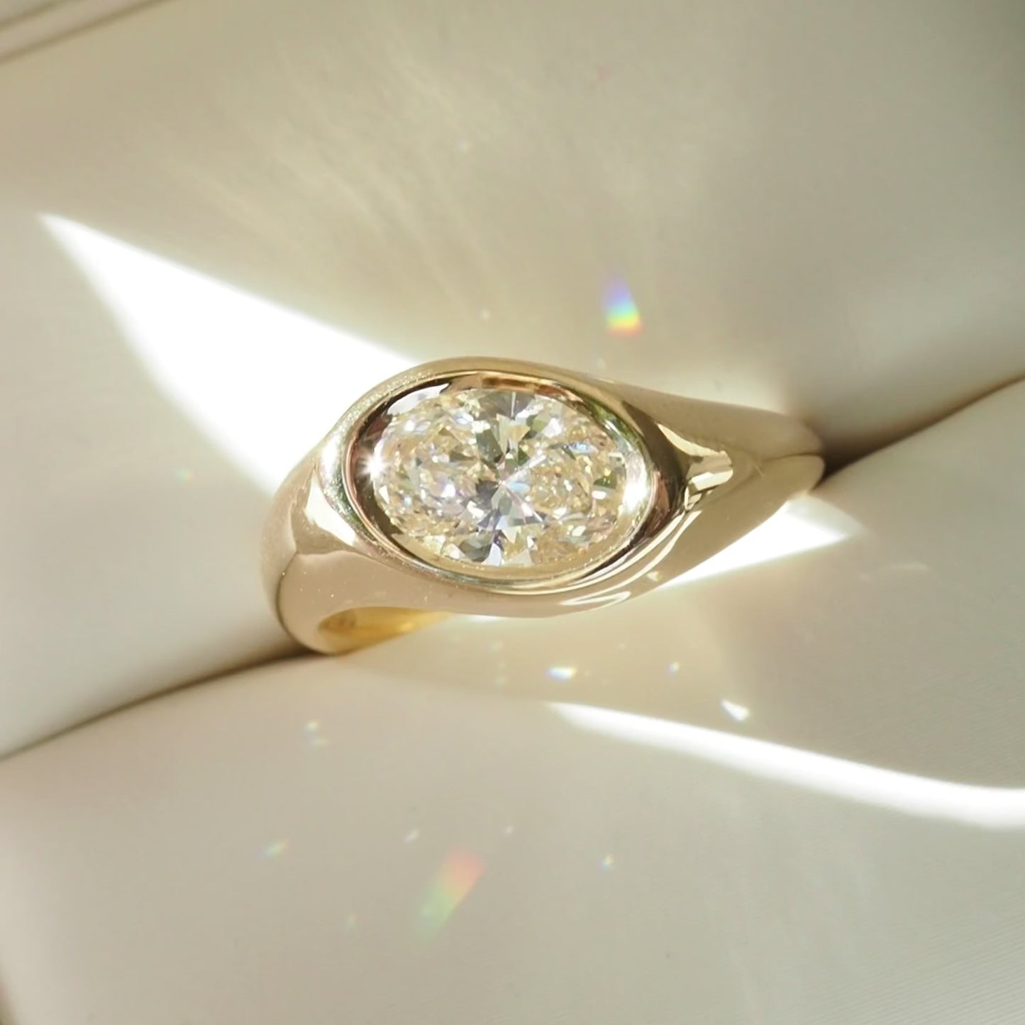 A modern signet, softly sculpting the silhouette of an oval lab-grown diamond— ready to wear
