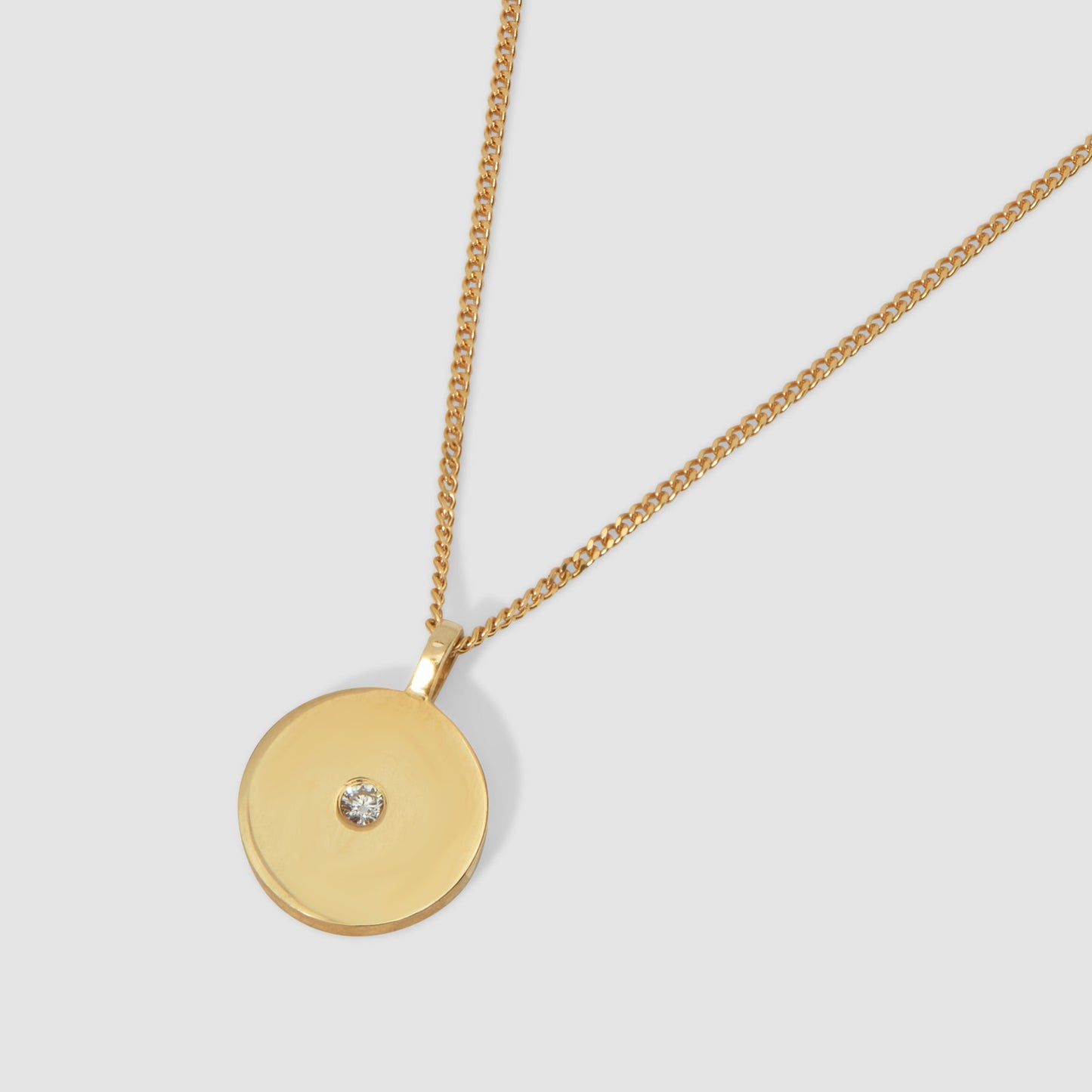 A beautifully weighted solid 9ct yellow gold round pendant featuring a flush set diamond in the centre of the pendant face.