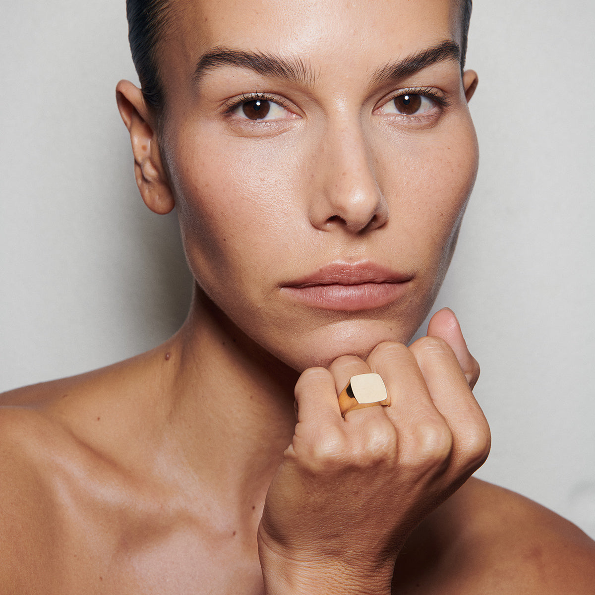 A classic structured signet — featuring a defined square-edged face & solid band profile