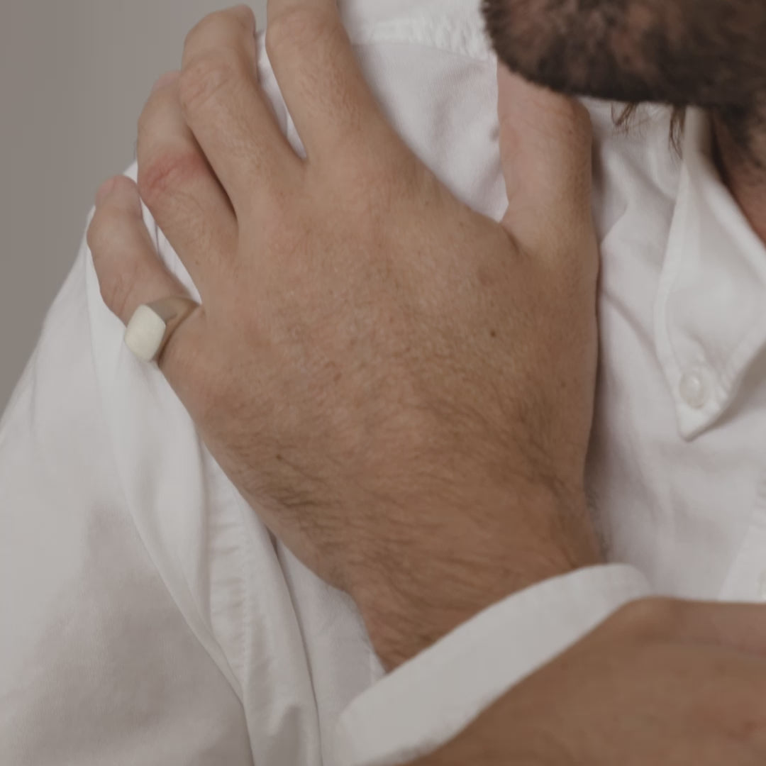 A bold volume ring with the ability to customise material finish and engrave on the face of the ring to create a unique piece; sentimental to you.