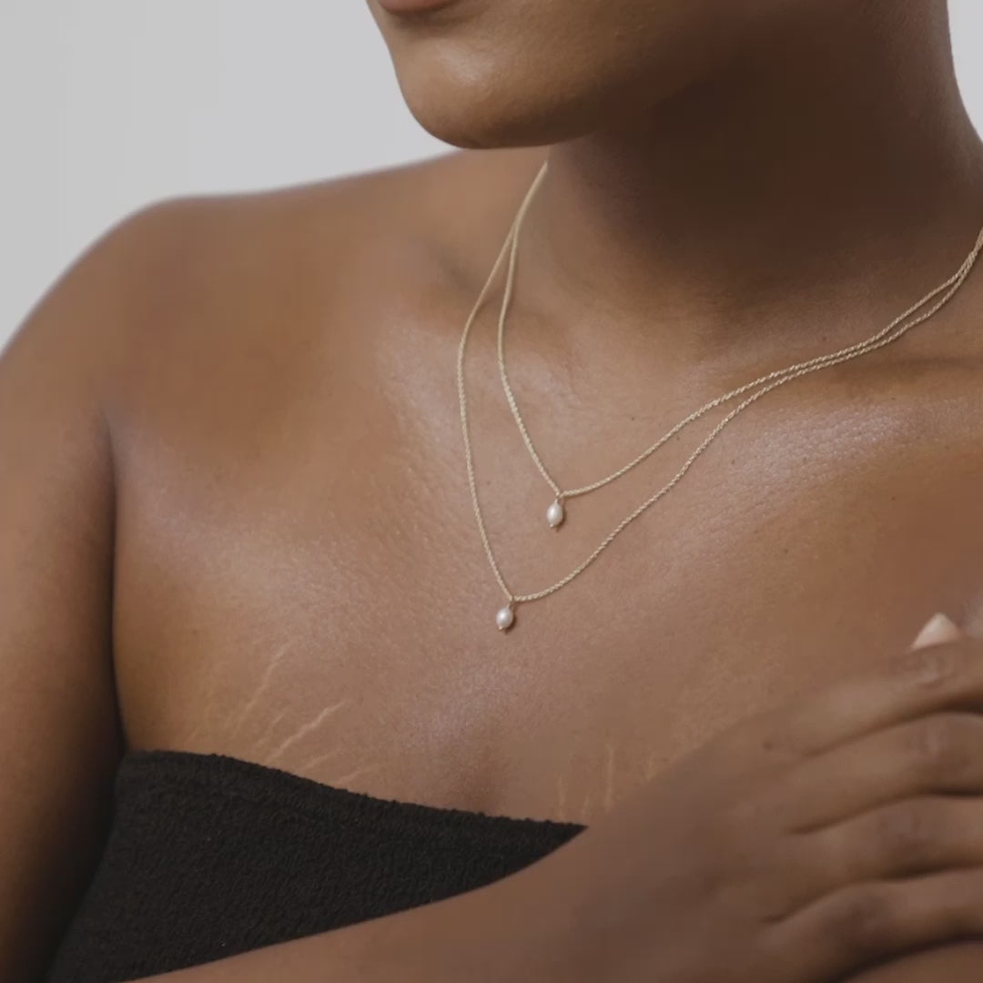 We take a tiny pearl selected by our Newcastle studio team and have our jewellers delicately wrap this with solid gold or silver wire. This is then strung onto our cable chain — a perfect everyday piece or ideal gift.